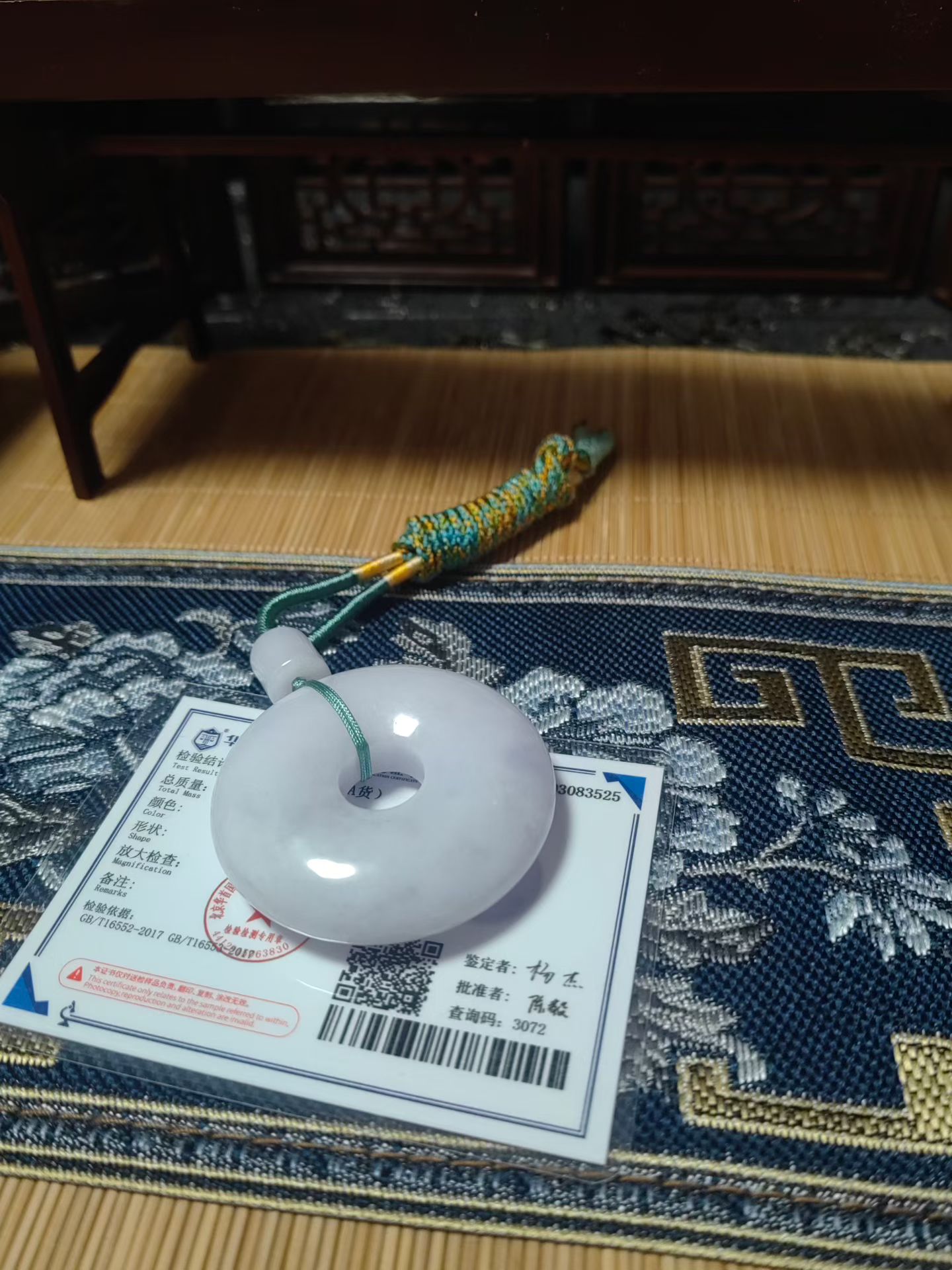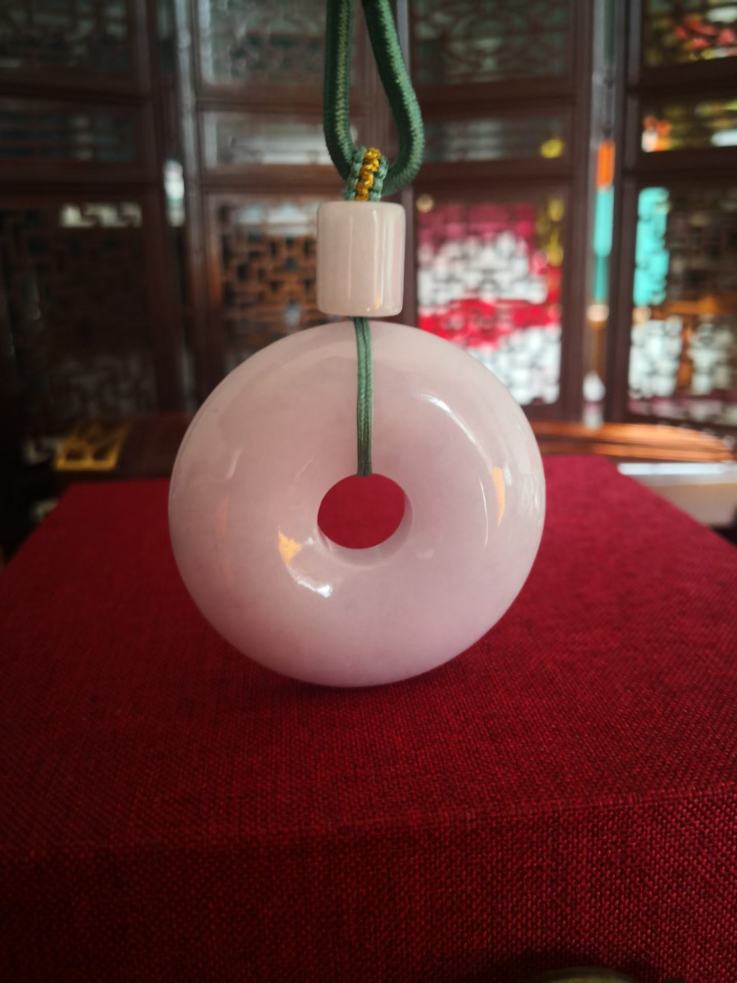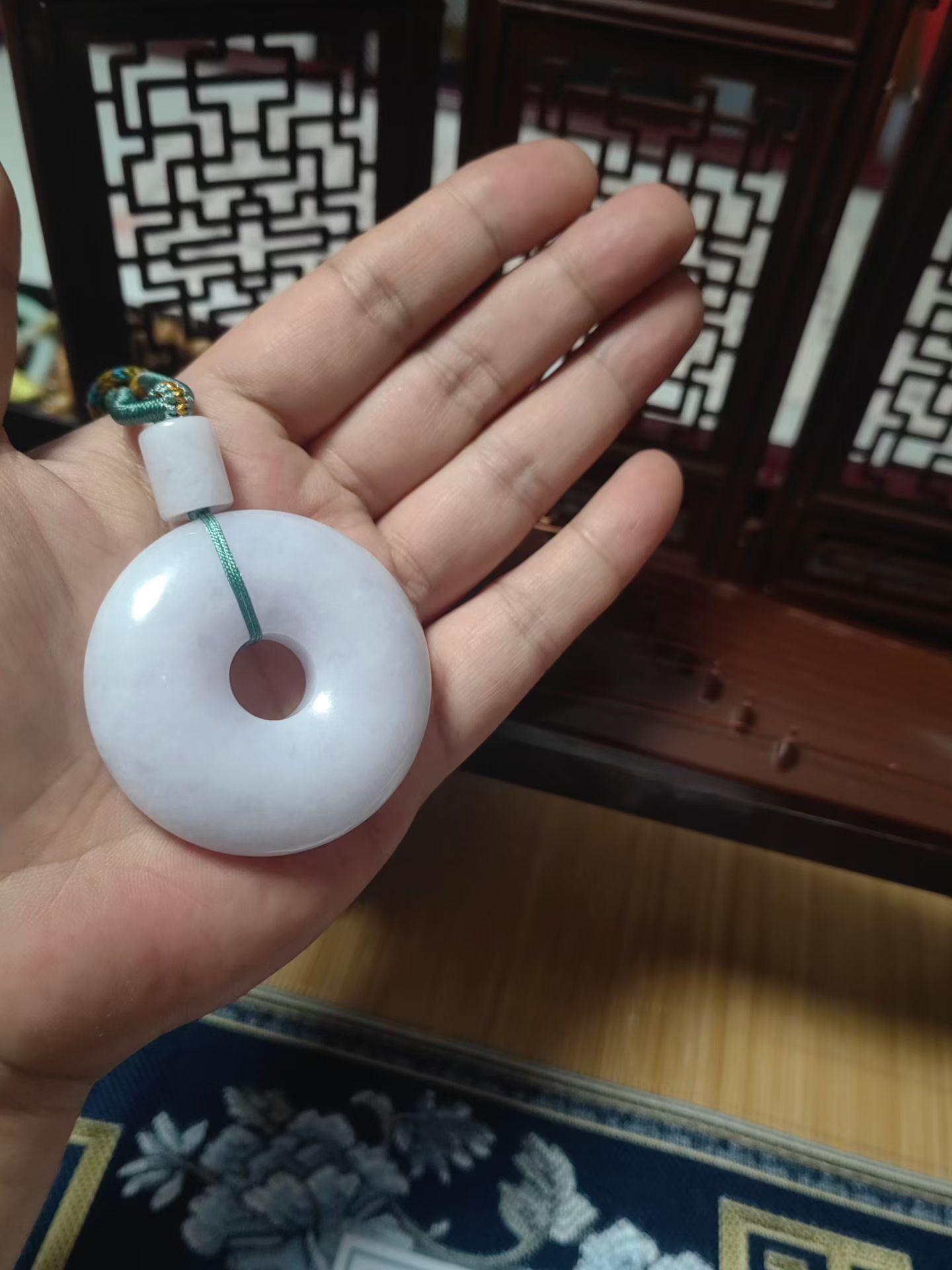 整体是浓郁均匀的粉紫罗兰底色,在自然光下依旧保持着温润柔美的粉紫调,见光不死,种水细腻通透,胶感满满,打灯无纹无裂,品相完美。平安扣造型圆润饱满,寓意“平安顺遂、圆满无忧”,是自带福气的吉祥佩饰,不管是自戴守护平安,还是送礼传递心意,都是绝佳选择。